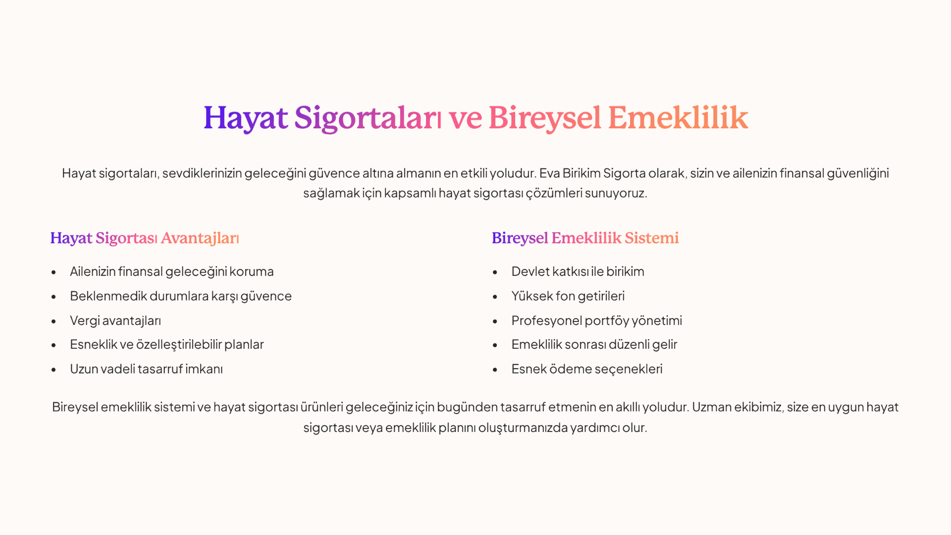 Birikimlerinizi ve geleceğinizi güvence altına almak için tüm sigorta ihtiyaçlarınızı karşılamaya hazırız. Bireysel emeklilikten trafik sigortasına kadar, hayatınızın her alanında yanınızdayız..
